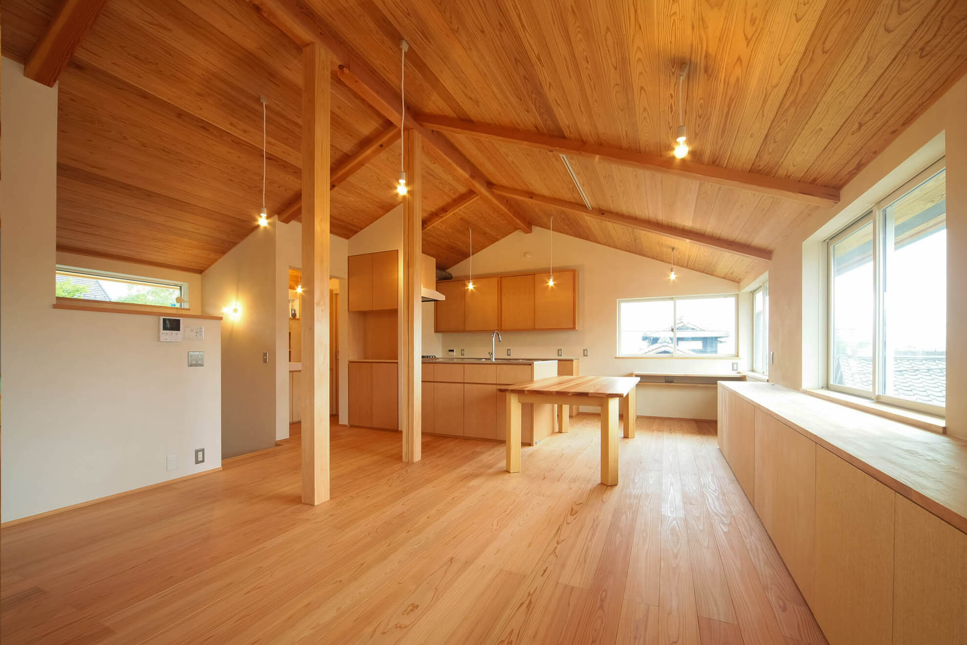 ・快適な居住環境: 厚い断熱材により、雨音の防音や夏の日射を遮る効果があります。これにより、室内は一年中快適な温度を保ちやすくなります。また、傾斜天井は高窓からの換気効率が良く、夏の排熱にも効果的です。